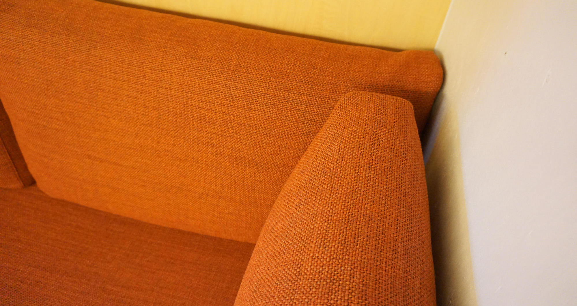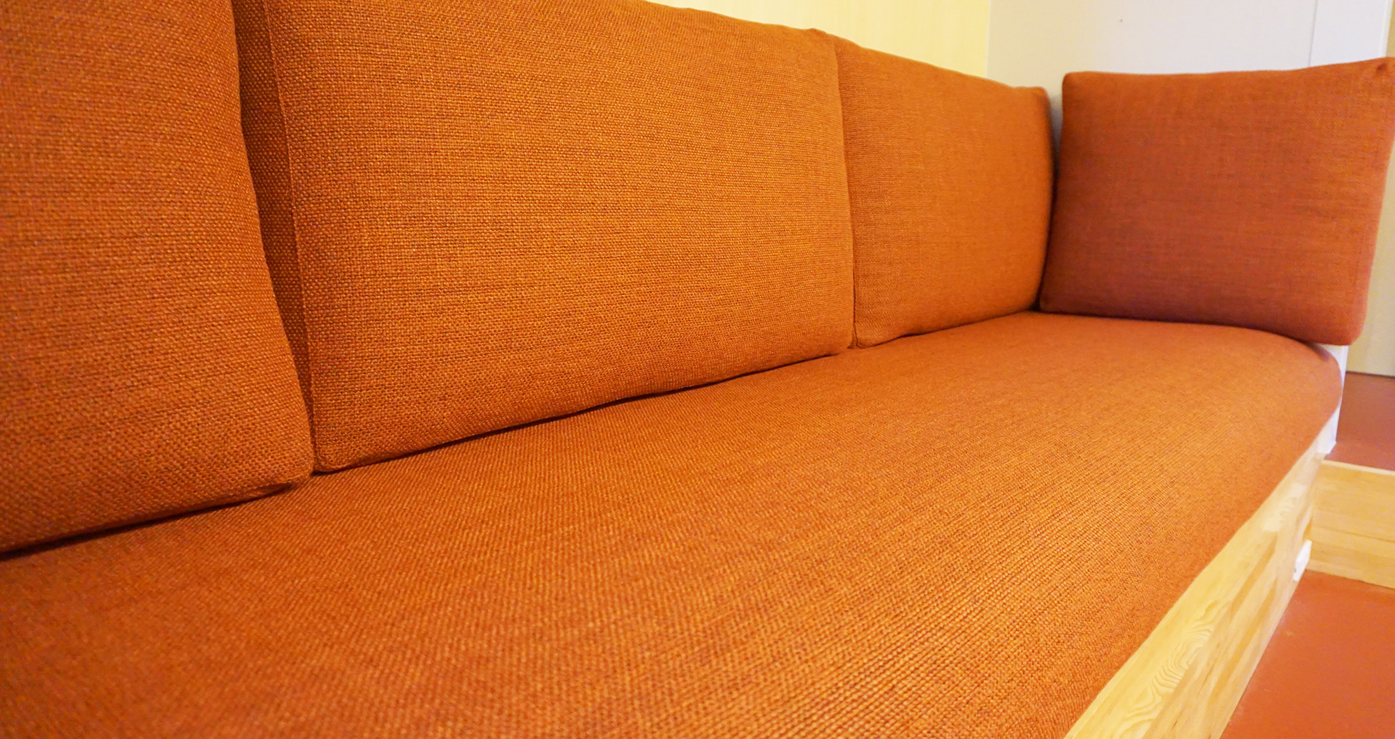 京都の新居完成を目前に控え、小上がりに設置するためのソファをご希望。ビビットなオレンジカラーのリノリウムで仕上げられた床にソファの前にはモニターを設置。リビングルームとは異なるおこもりスペースです。ちょっとお昼寝、時には映画鑑賞など、家族それぞれが自由に休憩できる場所として硬めのすわり心地を選択。ころんと、ふっくらの見た目とは異なりしっかりしたオールウレタン仕様。板座の上に設置されてしますが、しっとりくつろぎ感を十分に体感できる仕上がりとなりました。