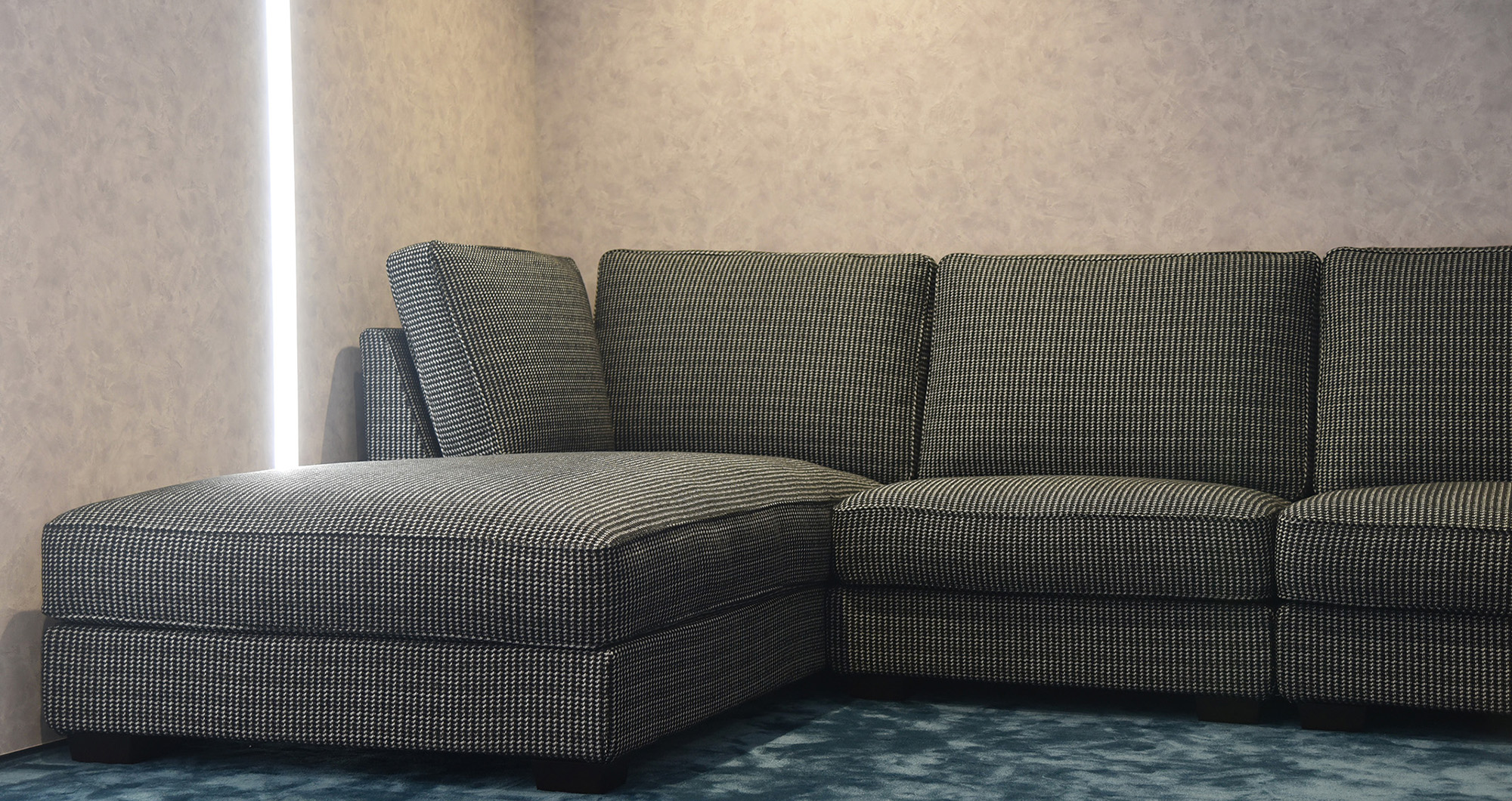 シアタールームのサイズに合わせて、アームレス3台とカウチ2台をバランス良くコの字形に設置。空間にFIXさせながらも、壁から左右6cmほど離し、通気性も確保しました。ハイバックが特徴で、背とアーム部分が同じ高さの為ホールド感がありゆったりとくつろぐことができます。