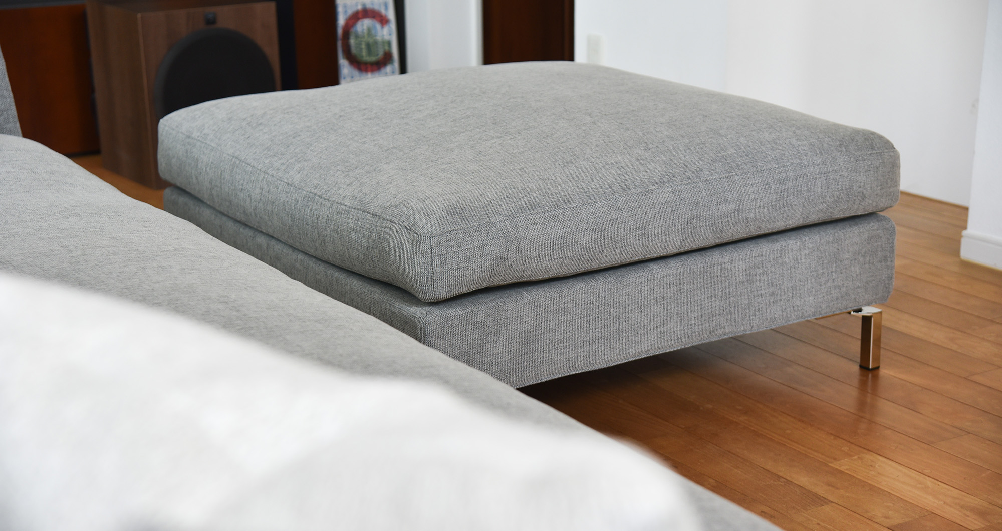 リフォーム後の新しいライフスタイルで使用するソファをご検討。デザインを気に入られた【FSB】が候補。ソファ背面の角度付きステップフロアに合わせて別注の変形ソファとなりました。合わせるオットマンも大型ソファ用に定番より250mm大きい950角オットマンを選定。部屋の形状に添わせてソファを配置できたので座面を広くとることができ、空間にリズムが生まれて広々とした印象を受けるベストな選択になりました。