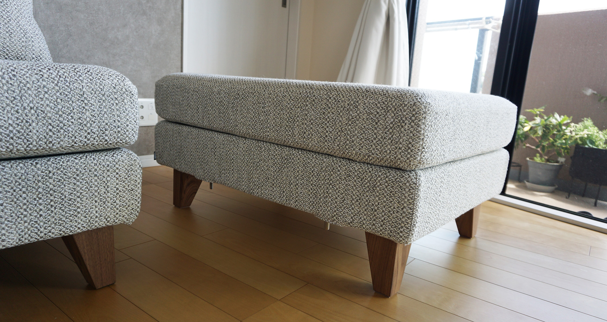 毎日通る通路だから、少しでもストレスがあってはいけない。それでいて、できるだけ座面は広くとりたい。ぎりぎりを調整するため、2ピースのソファを、1cm単位で調整してお作り致しました。座面幅に合わせたオットマンを、前に持ってくると、ゆったりと脚を伸ばせる仕様に早変わりです。座の高さ・硬さもこだわり、長時間座りやすく、立ったり座ったりもしやすい、固めのオールウレタン仕様を、通常より少し高めに製作致しました。