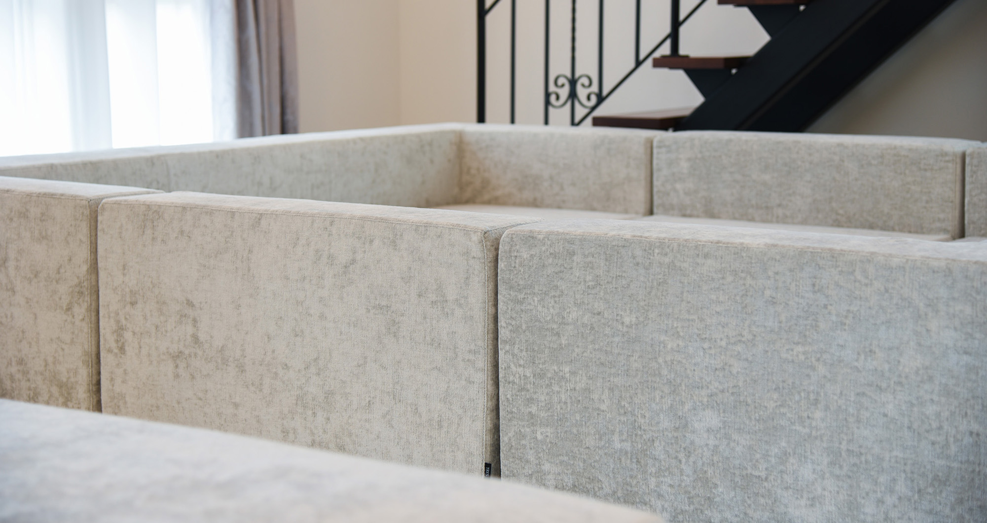 ご希望によりsofa【FRM】をベースとして独創的なソファを製作することになりました。完成したソファは、TRES初の5ピースの別注アイランド型ソファです。sofa【FRM】は背が低く設計されているので視線が抜け、圧迫感が少ないことが特徴です。また、ご家族の気配を自然と感じられ、コミュニケーションが生まれる空間になりました。