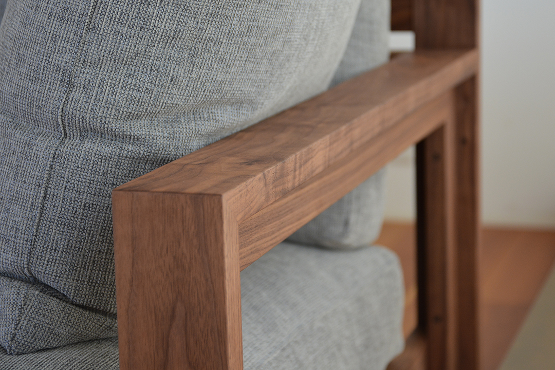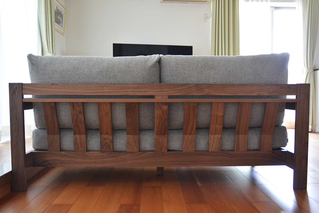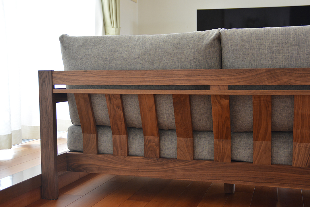 ウォルナットの持つ、重厚で美しいソファの後ろ姿が目に飛び込んできます。