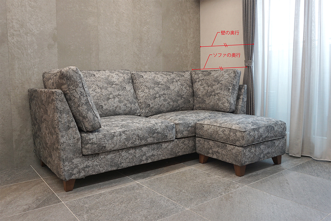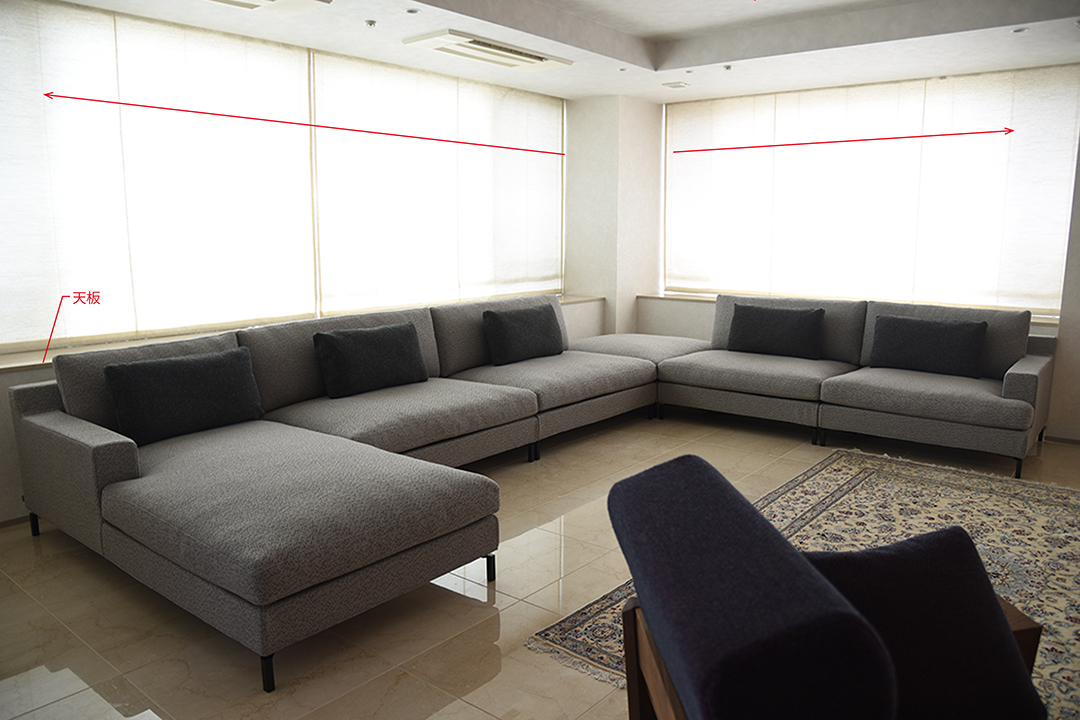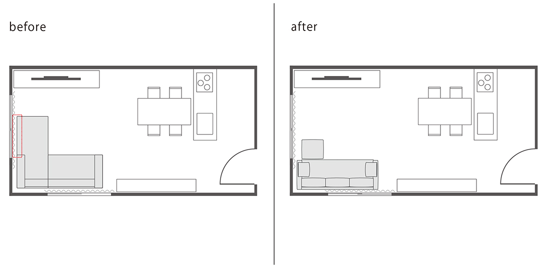 今回のように窓際にカウチソファを配置するのは、よくあるケース。理想は窓から50cm以上空間を設けること。またどの程度窓にソファが重なるのか確認する必要があります。