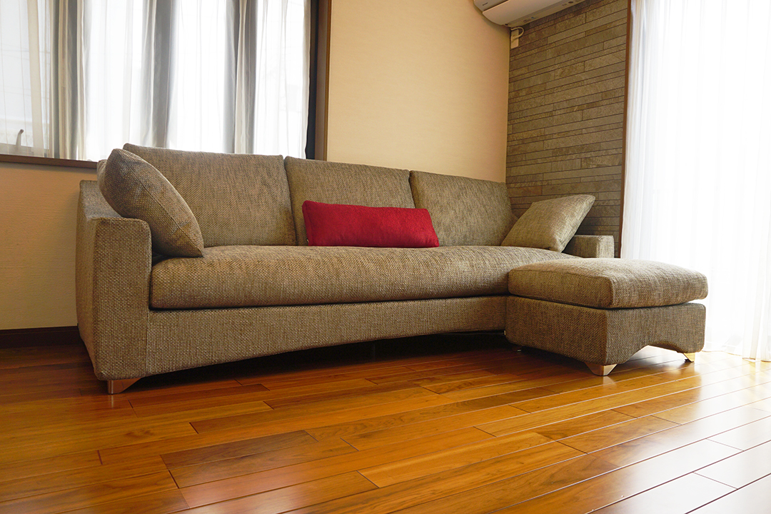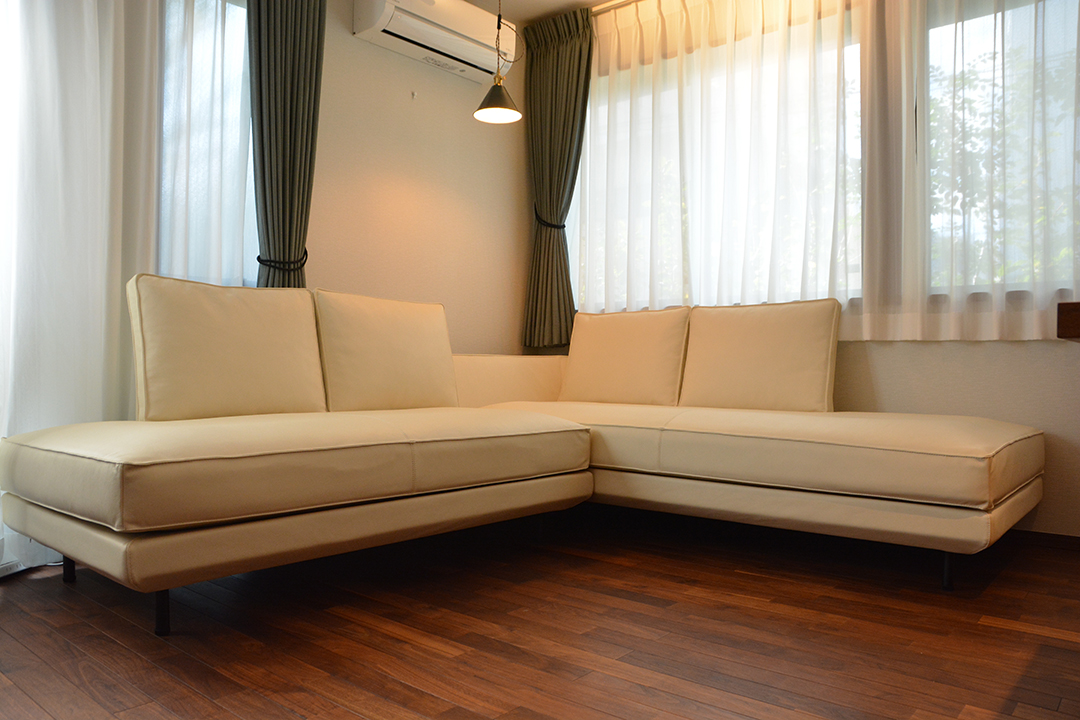 ボリューム感のあるカウチソファセットを10年愛用されていたT様。窓まわりのお掃除のしづらさと、ソファが窓を遮る形になり、圧迫感が気になっていたといいます。買替を機に悩みも解消したいという思いからソファを検討。まず窓の側をすっきりとさせるためにL字型からストレートに形状を変更。オットマンを合わせることでカウチタイプにも変形するスタイルを選ばれています。