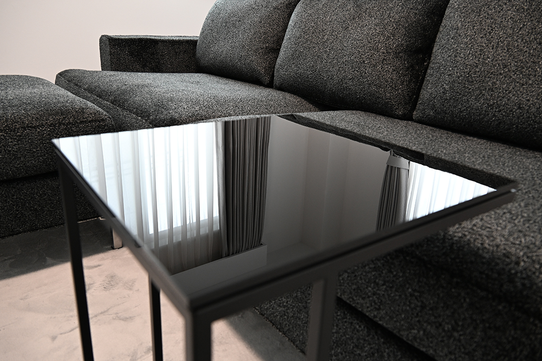 鏡面のように反射する天板と、細身のフレームが、ブラックでありながら、圧迫感を感じさせないインテリアとして、お部屋になじみます。