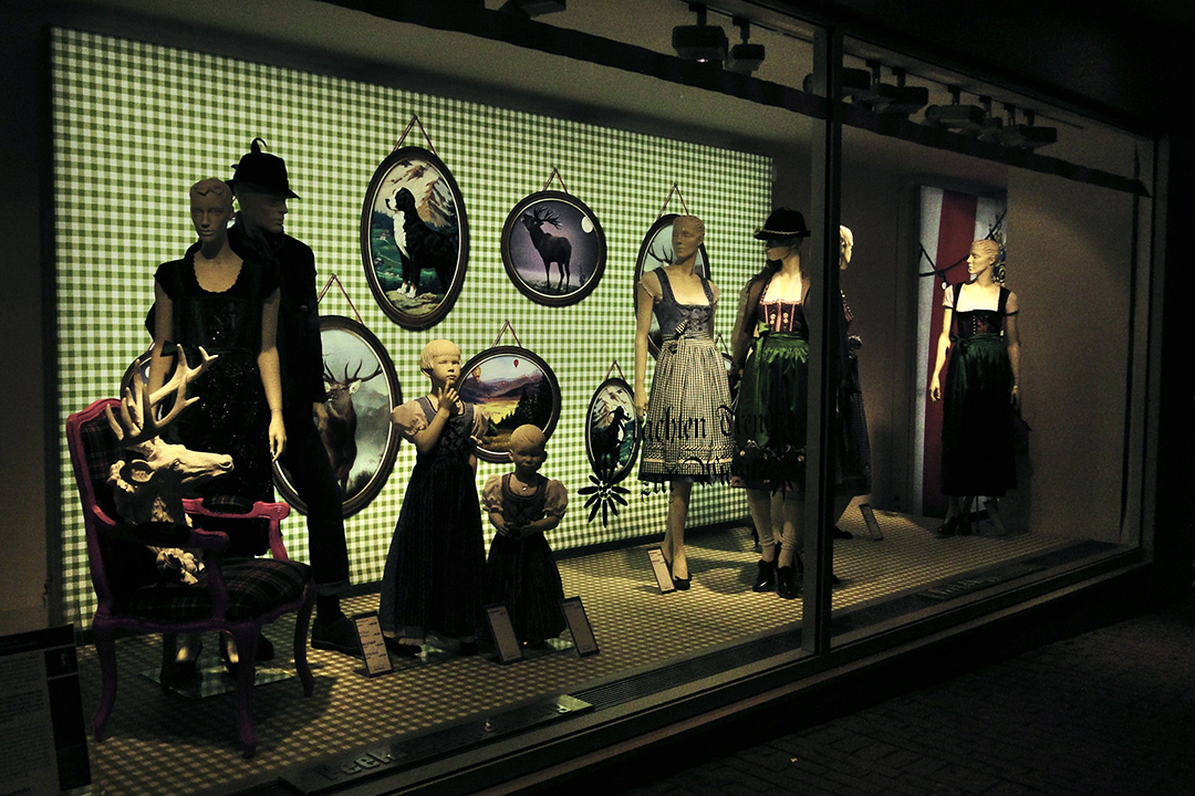 この季節、ドイツの服屋さんのショーウインドウには、この民族衣装を着せたマネキンが並びますが、毎年着こなしやデザインに流行があるそうです。