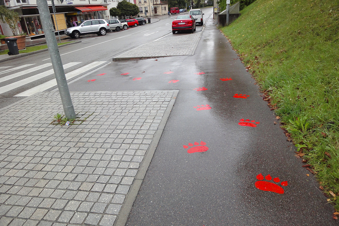タイルで飾られた、小ぶりで可愛い駅を一歩出ると、道にはどうぶつの足跡がついています。