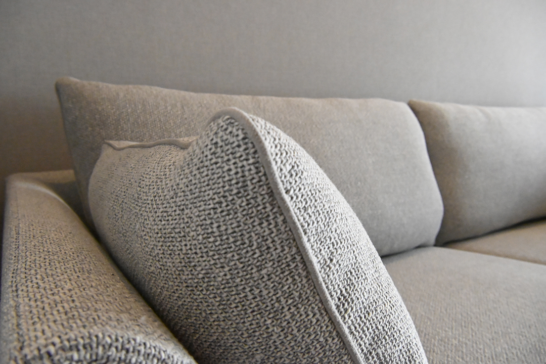 FNSの細やかな織と平織のフラットな表情がクッションのコントラストに。
