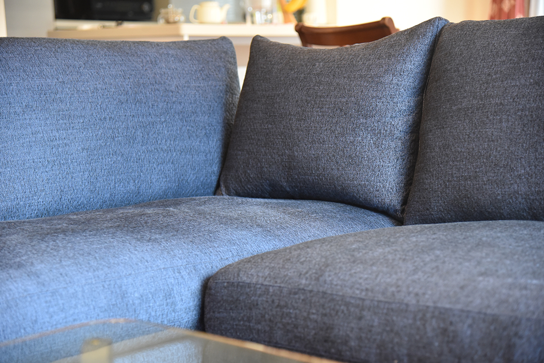 お使いのソファは膨らみが戻り新品と見分けがつかない程に復元しました。