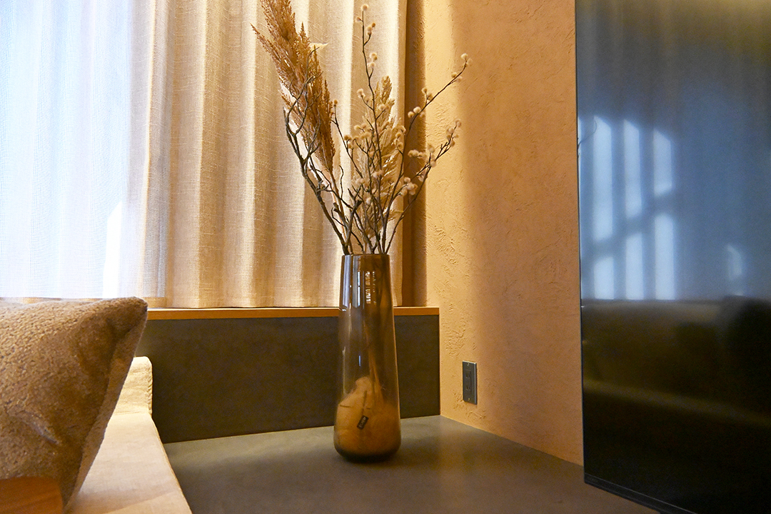 左右は造作棚をアシンメトリーになるように高低差をつけて設置。