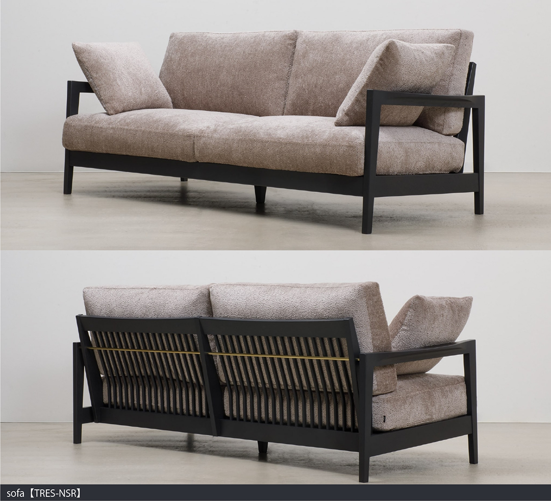あたたかみを感じる木材に金属やガラスなど異素材を組み合わせることで洗練された印象に。画像はsofa【TRES-NSR】。ソファの中では珍しく、背面とアーム部分に真鍮が通されているデザイン。木部もダークグレーで塗装されているため、ソファそのものからシックで落ち着きのある雰囲気が漂います。