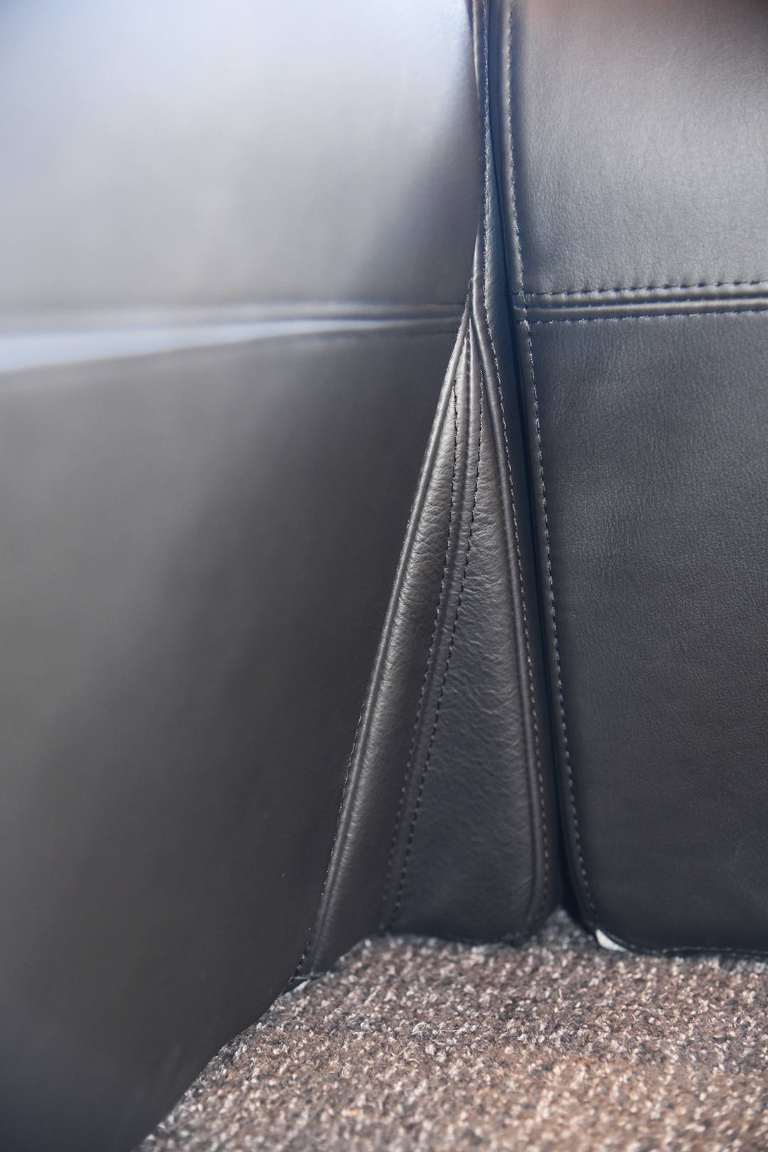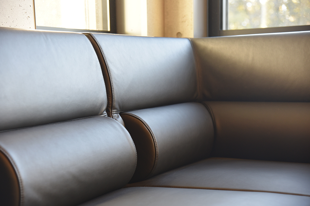 その部分を、レザーの細かなパーツを用いて、両サイドのソファと上手く面合わせ。