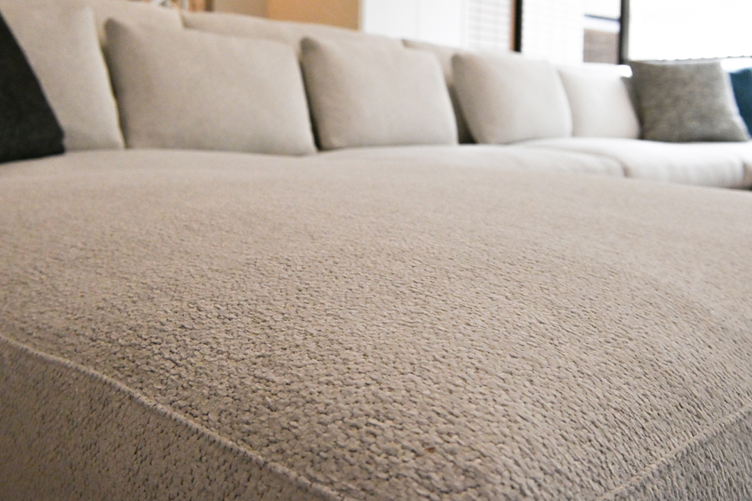 飼ってらっしゃる猫ちゃんや、遊びに来る赤ちゃんの、とっさのアクシデントにも対応できるように、張地には撥水加工をオプションでかけて頂きました。