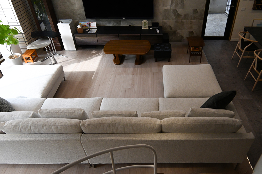 お部屋いっぱいのソファに、お客様からは「座り心地も見栄えも素晴らしいソファにただただ感動しております。」とのお言葉を頂戴しました。