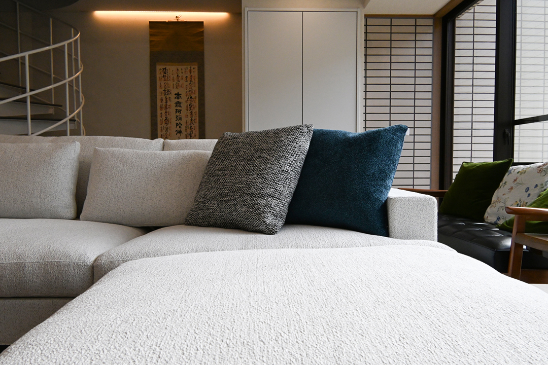 大き目の500角のピロークッションも、大型ソファの上ではしっくりときています。